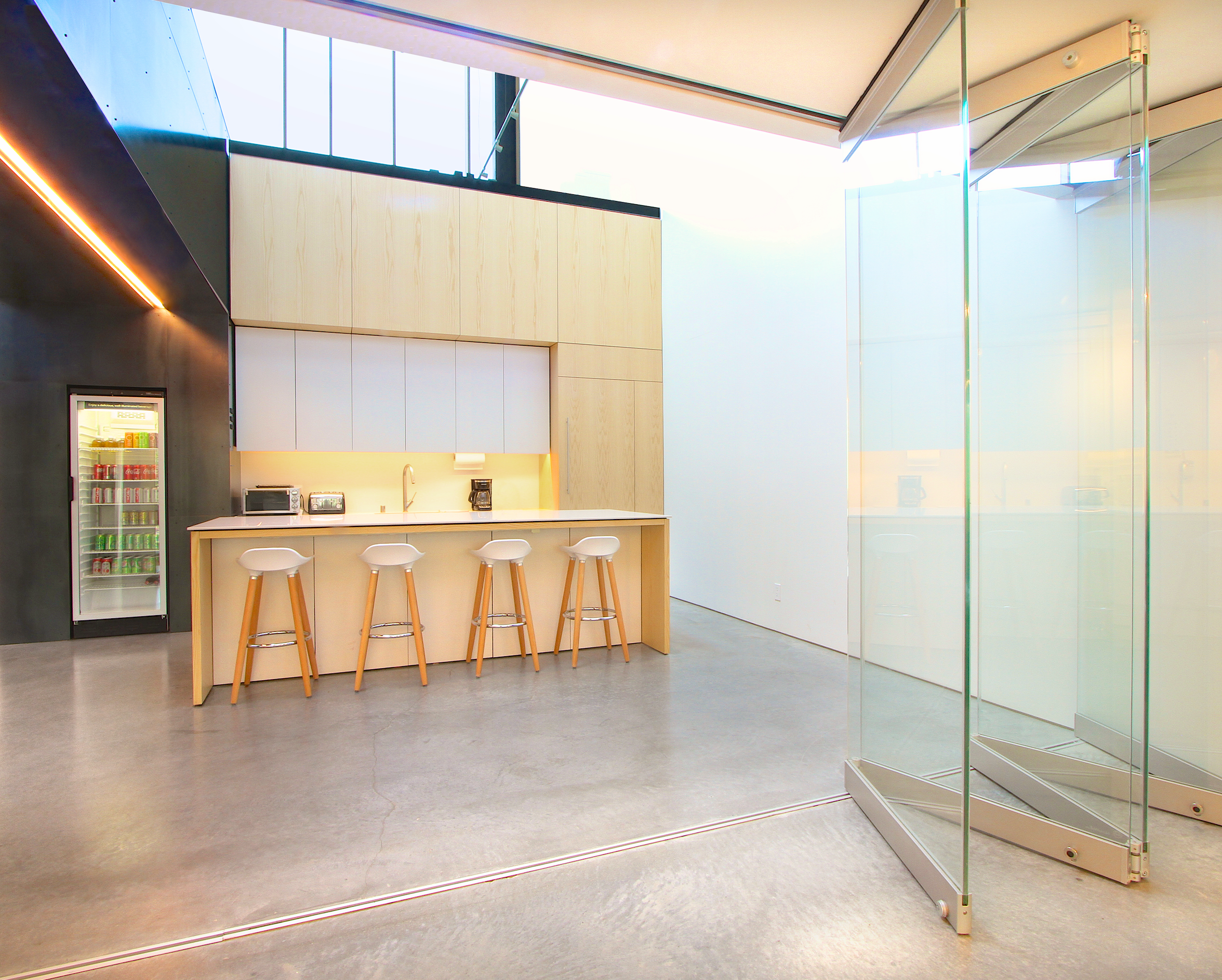 Inviting kitchen+island seating area interfaces with the main conference room with retractable glass doors — easily transforming into one large space for group meetings and celebrations, lunch-and-learn sessions, or hosted evening events.